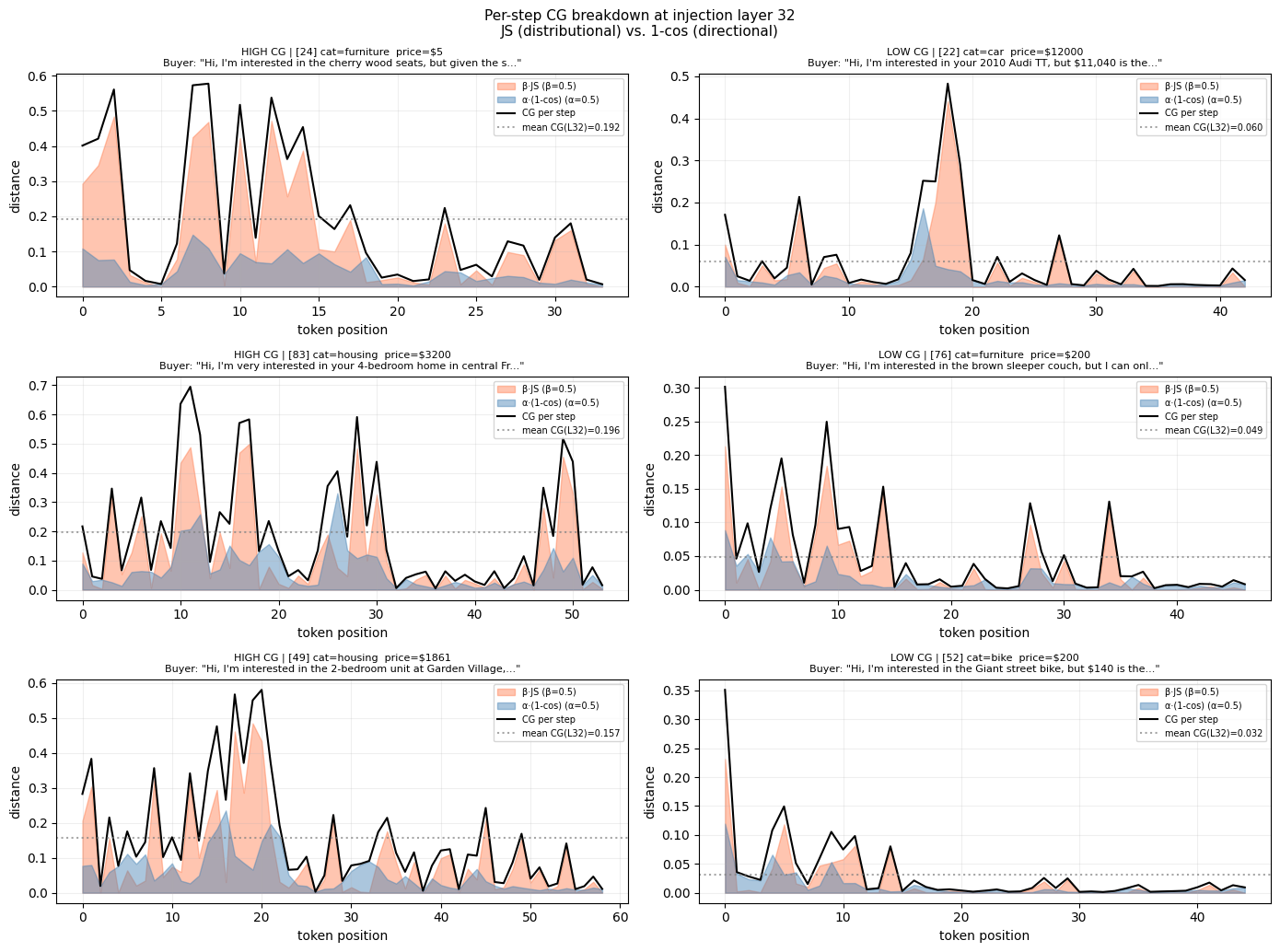 Figure 3. Per-step CG breakdown at injection layer 32, decomposed into distributional divergence (β·JS, orange) and geometric drift (α(1−cos), blue). Left: high-CG scenarios. Right: low-CG scenarios.