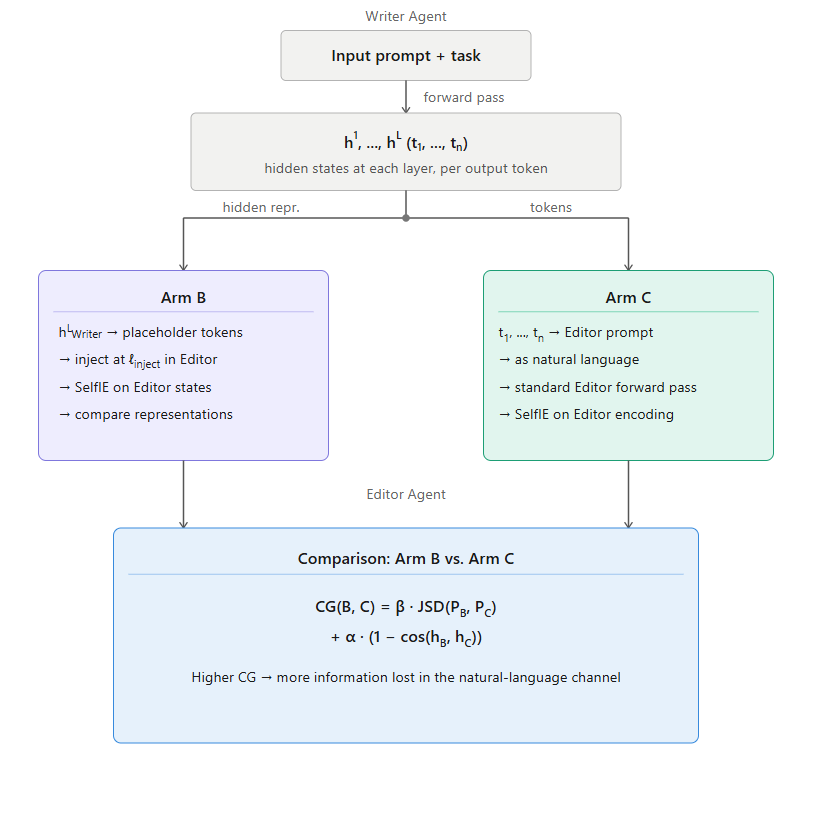 Figure 1. Diagram of the project methodology comparing direct latent transfer (Condition B) against natural-language transmission (Condition C).