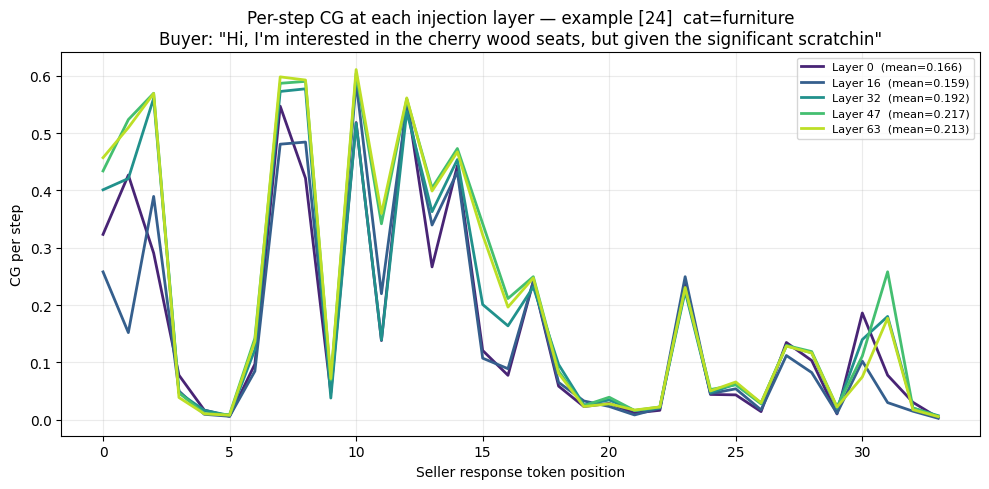 Figure 2. Per-step CG at five injection layers (0, 16, 32, 47, 63) for an electronics scenario. Layer means range from 0.175 to 0.218, indicating low sensitivity to injection depth.
